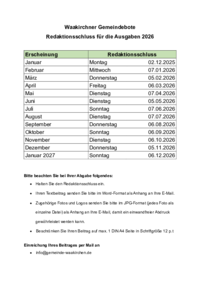 Waakirchner Gemeindebote Redaktionsschluss für die Ausgaben 2026 Erscheinung Januar Februar März April Mai Juni Juli August September Oktober November Dezember Januar 2027 Redaktionsschluss Montag…